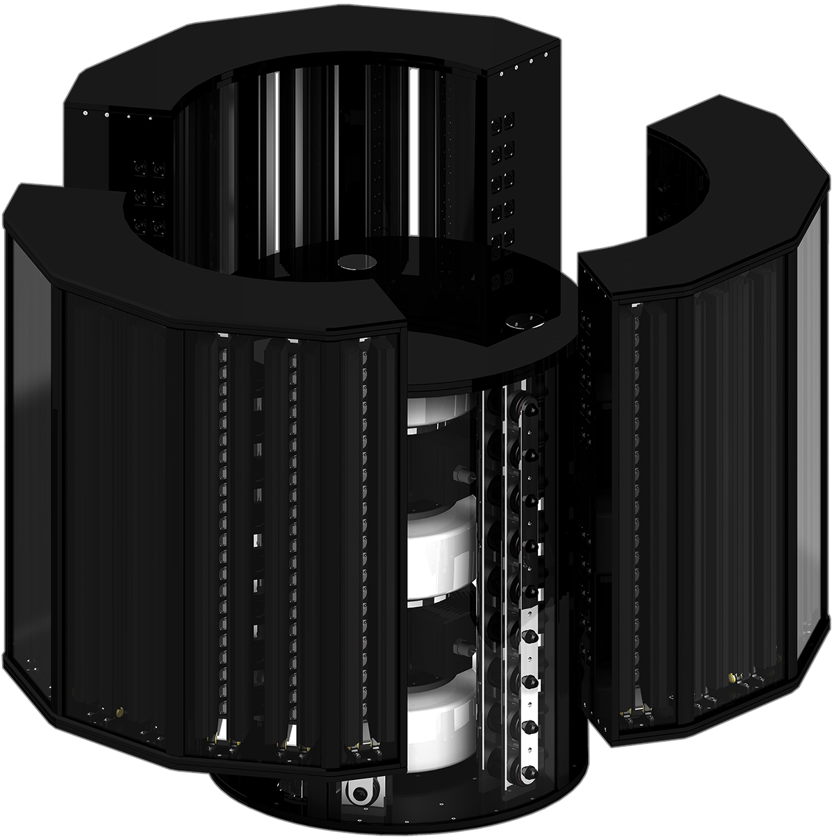 The external structure is made of aircraft aluminum. It is an impressive black 8-sides excavated prism (WHD) 1.25 x 1 x 1.25 m (49.2" x 39.4" x 49.2"), 650 kg (1.433 lb), but its structure changes once the device is turned on 1.85 x 1.3 x 1.85 m (72.8" x 51.2 x 72.8"). It is divided into three distinct sections to reveal all the electronics at a glance.